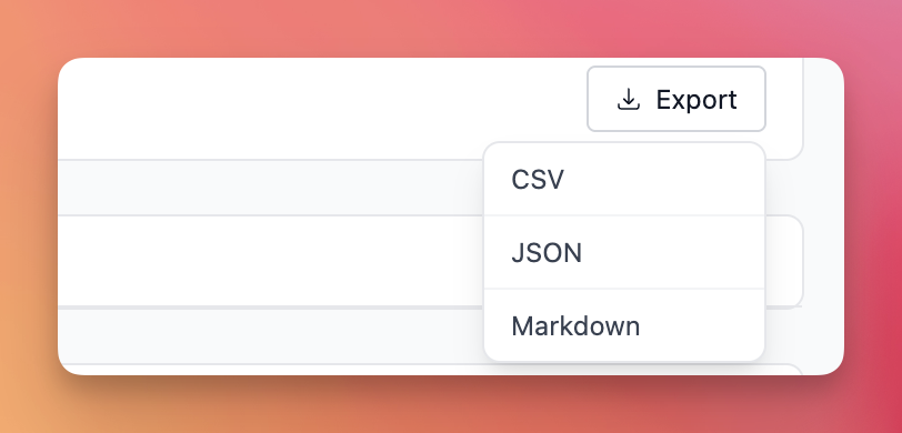 After running a query, click the Export button below your results table. You can download your data as CSV, JSON, or Markdown files instantly.